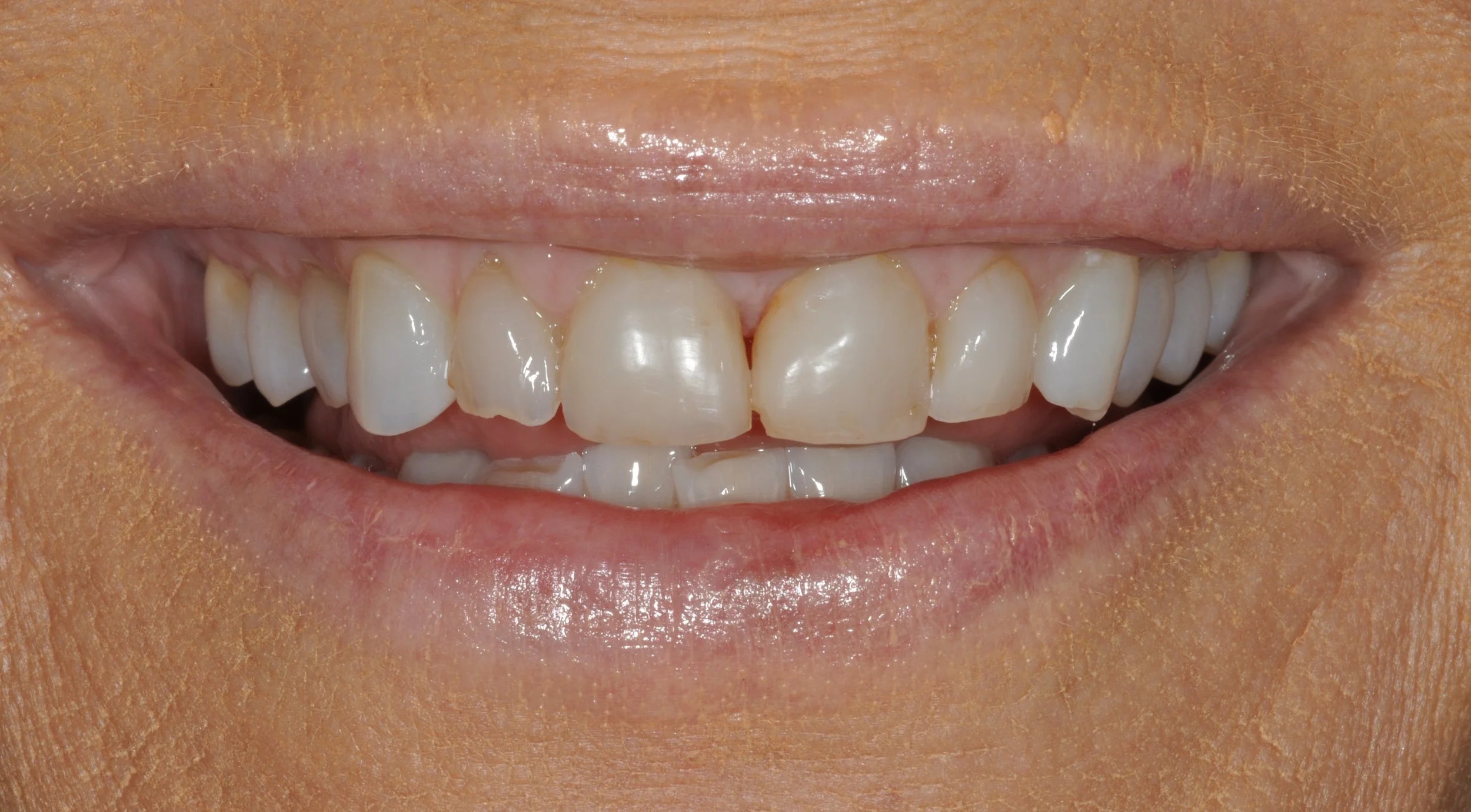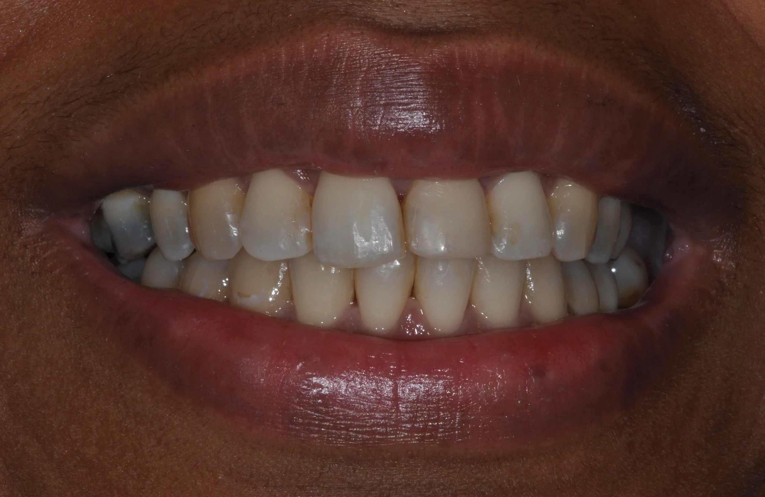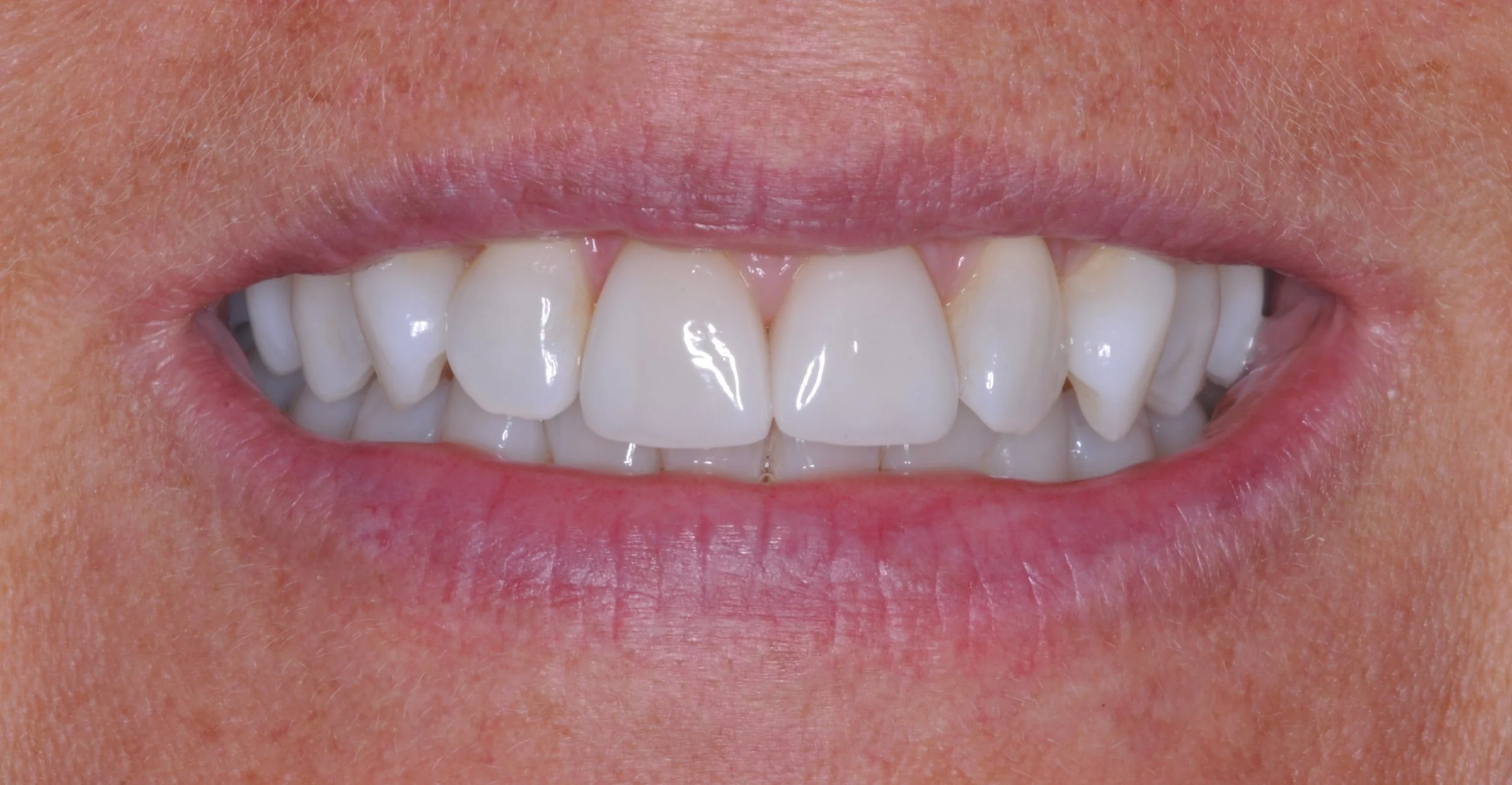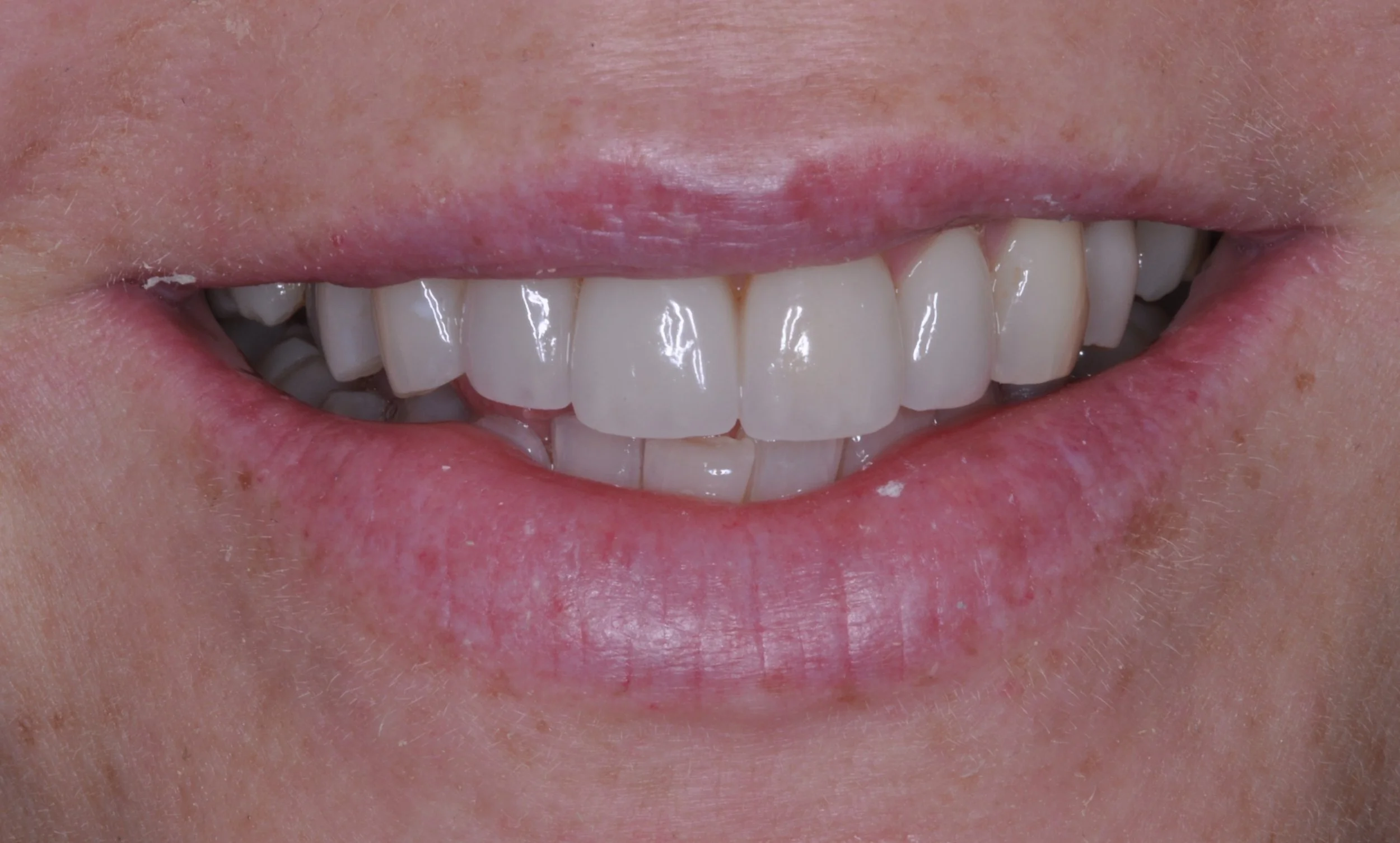 53-årig kvinna med slitna tänder. Hennes önskemål var att återställa tänderna till ursprunglig form samt att få riktigt ljusa tänder. Det löste vi med 24 porslinskronor.