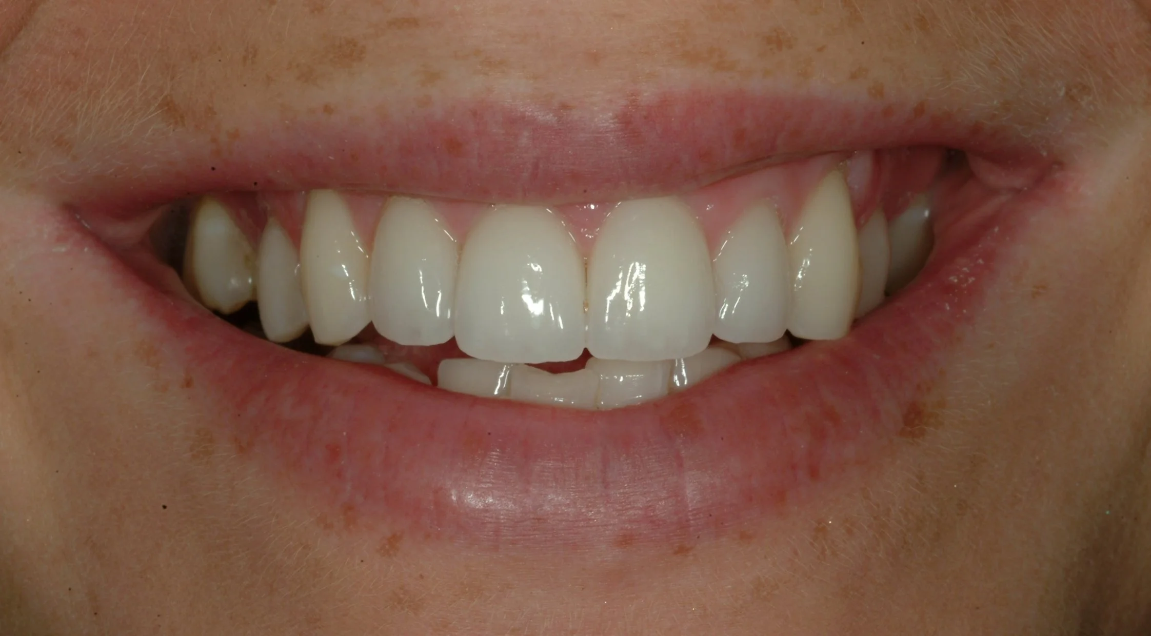 40-årig kvinna som inte var nöjd med utseendet på sina framtänder. Blekning, en porslinsfasad och byte av en plastfyllning.